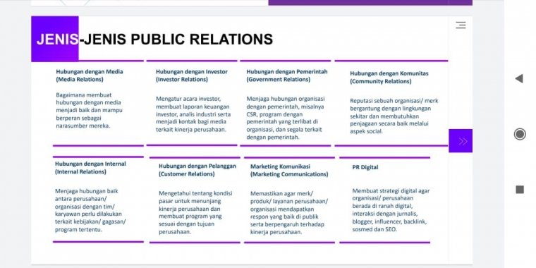 - Hubungan dengan Internal (Internal Relations), tugasnya adalah menjaga hubungan baik antara perusahaan/organisasi dengan tim/karyawan perlu dilakukan terkait kebijakan/ gagasan/ program tertentu.